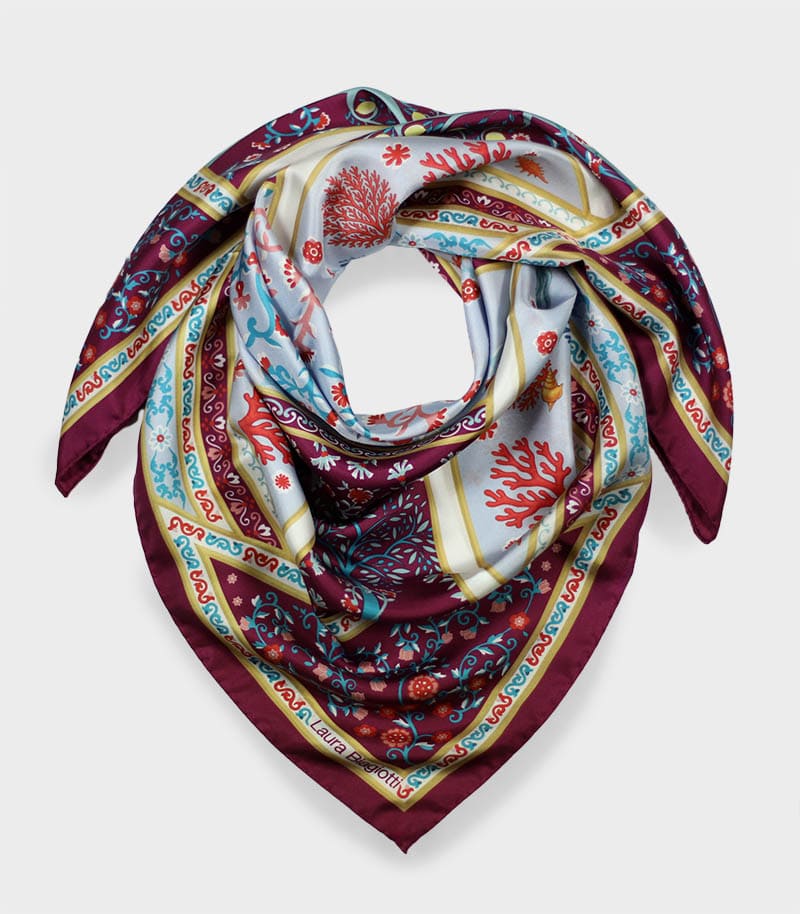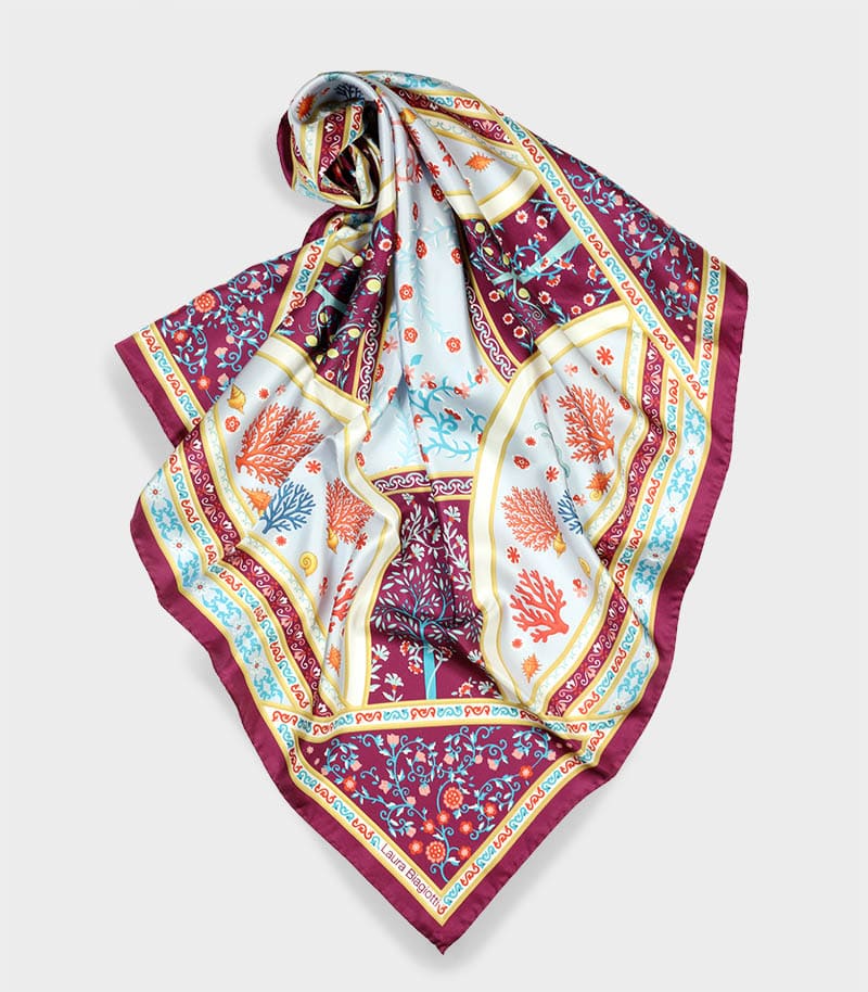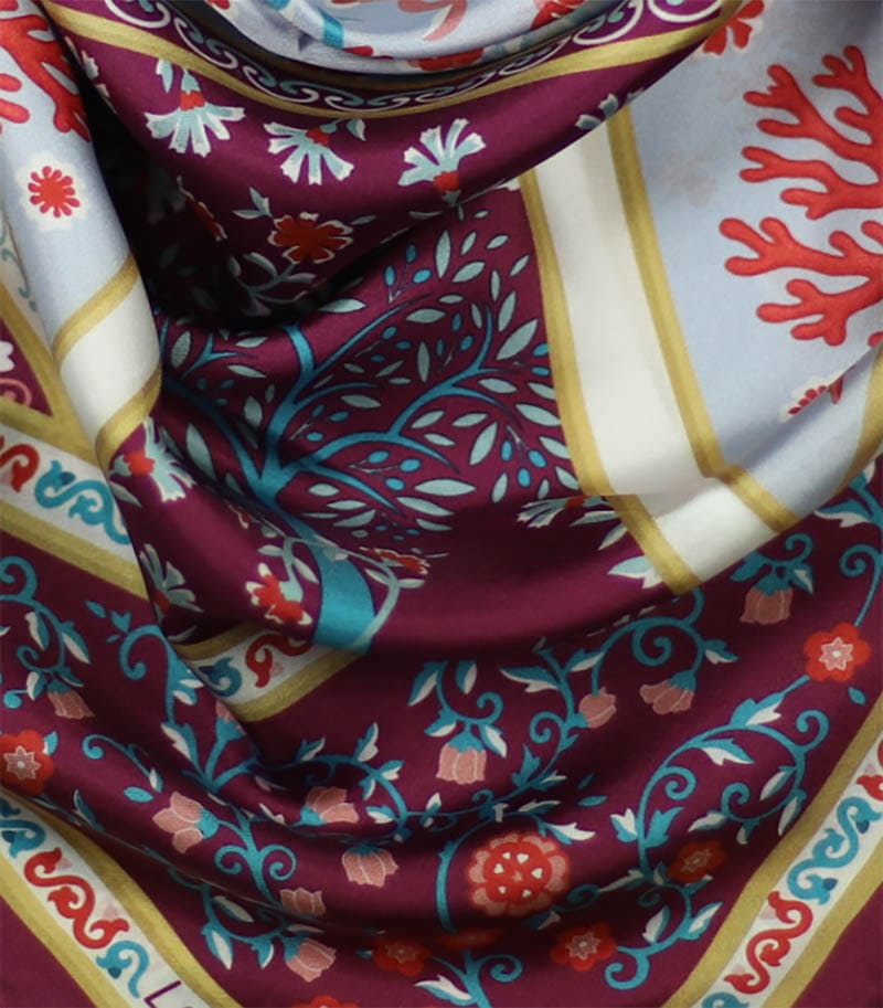 Apaszka jedwabna 90x90 Laura Biagiotti w eleganckim odcieniu fioletu przyciąga uwagę bogatym, ornamentowym wzorem inspirowanym klasycznym wzornictwem. Głęboka kolorystyka w połączeniu z dekoracyjną kompozycją nadaje całości wyrafinowanego i stylowego charakteru.