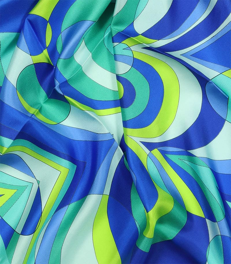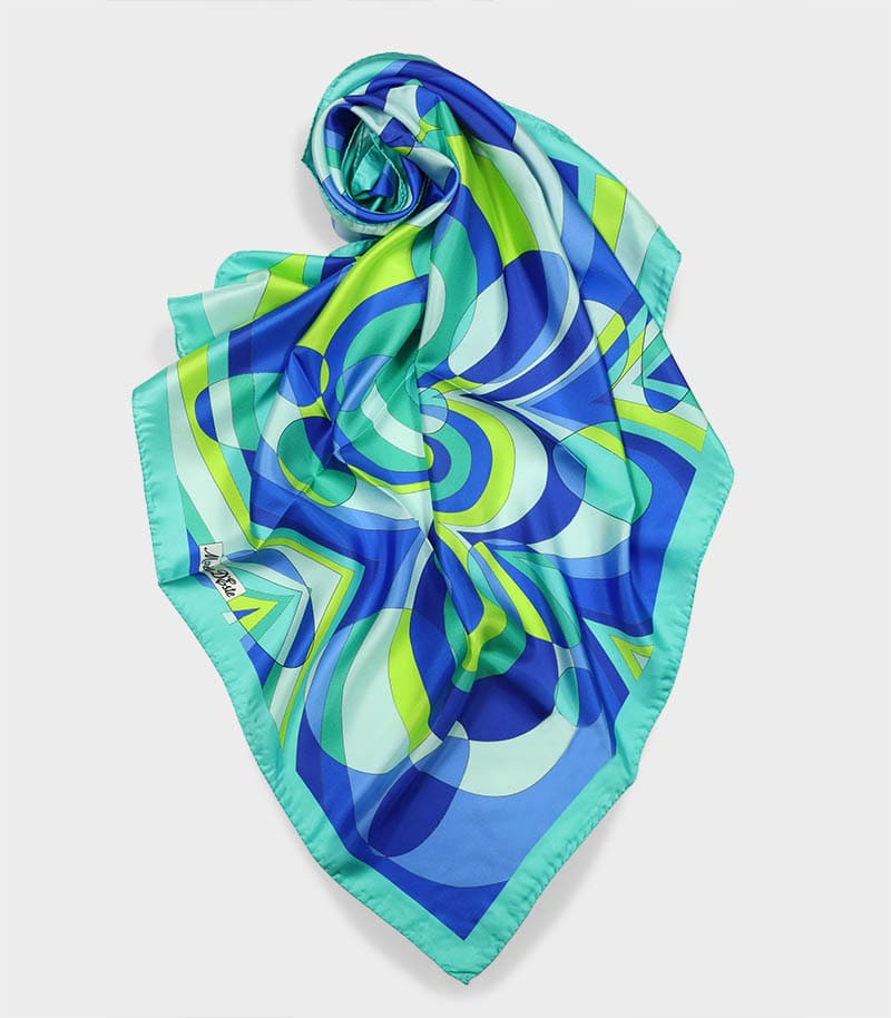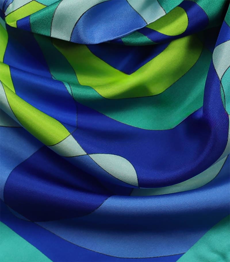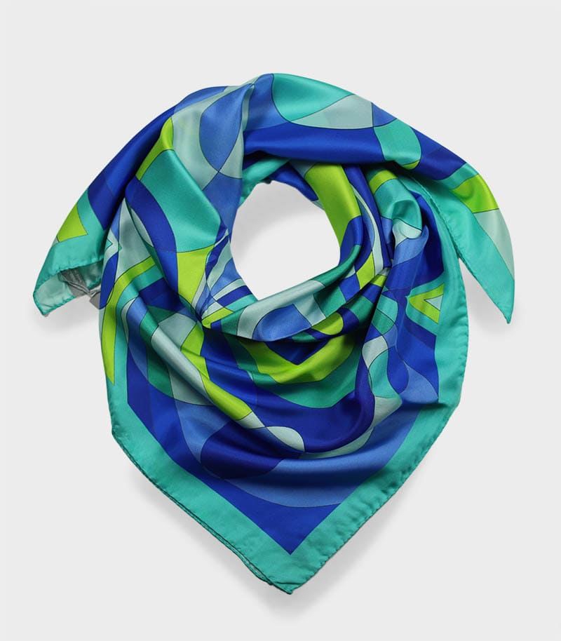 Apaszka jedwabna włoska 90x90 w odcieniach turkusu i kobaltu przyciąga uwagę dynamicznym, nowoczesnym wzorem oraz wyrazistą kolorystyką. Kompozycja wygląda świeżo. Dlatego całość prezentuje się efektownie i bardzo stylowo.