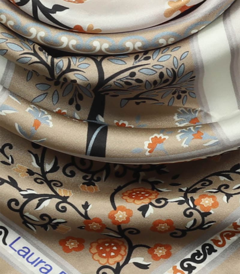 Chusta jedwabna włoska 90x90 botaniczna zachwyca subtelnym wzorem inspirowanym naturą oraz elegancką, stonowaną kolorystyką. Kompozycja wygląda lekko, dlatego całość prezentuje się harmonijnie i bardzo stylowo.