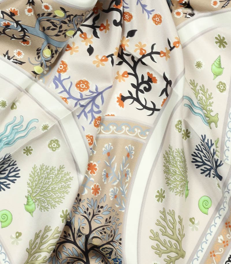 Chusta jedwabna 90x90 botaniczna wyróżnia się delikatnym rysunkiem roślinnych form oraz ornamentów. Jednocześnie miękkie przejścia kolorów budują głębię, dzięki czemu każdy fragment wygląda wyjątkowo.