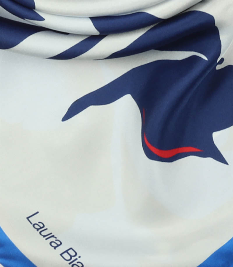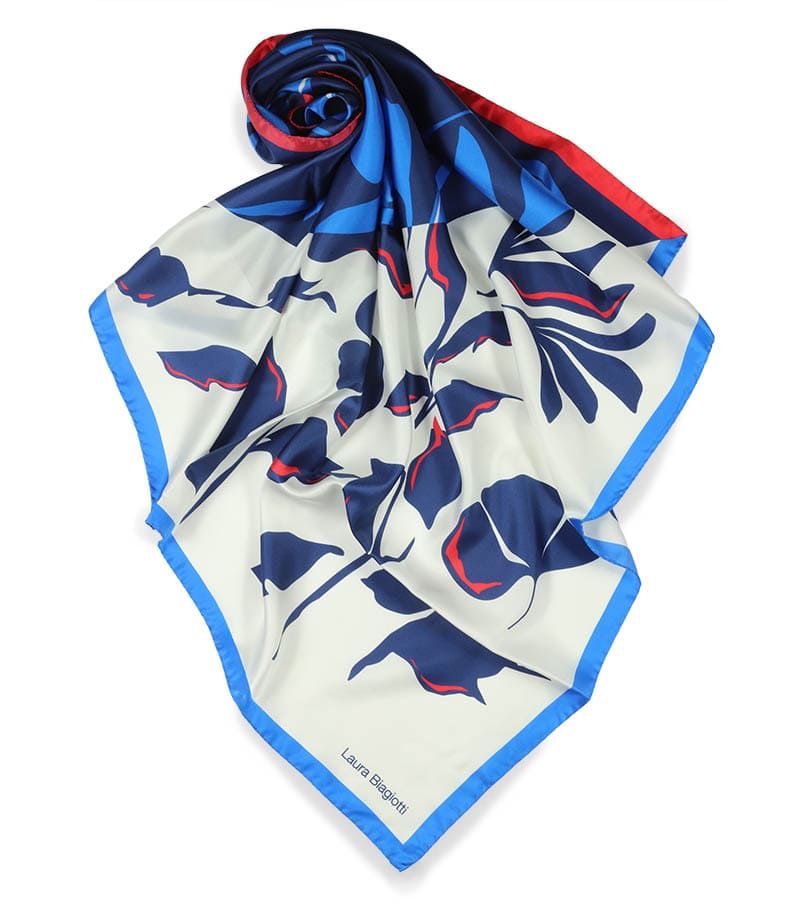 Elegancka apaszka jedwabna 90x90 Laura Biagiotti w kolorze ecru i granatu to wyjątkowe zwieńczenie każdej Twojej stylizacji. Zafunduj sobie nutkę wyrafinowanego luksusu! To niepowtarzalny i wyjątkowy projekt. Tę apaszkę wykorzystasz jako dodatek do biznesowego garnituru albo romantycznej, zwiewnej sukienki na wieczorne wyjście. Subtelny wzór przyciąga uwagę, ale nie przytłacza, a intensywne kolory podkreślą Twoją urodę. Zawiąż ją na szyi lub po prostu zarzuć na ramiona – tak, jak lubisz. Będzie także nieocenionym dodatkiem jako apaszka/chusta na głowę. Apaszka powstała z 100% -ego naturalnego jedwabiu.