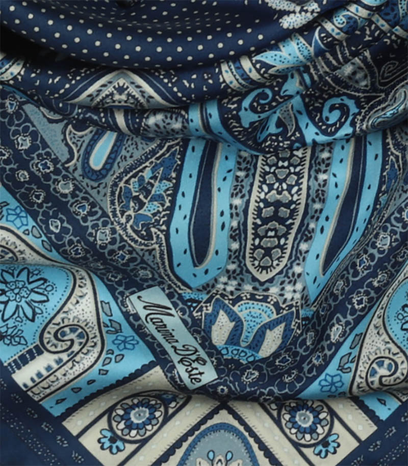 Elegancka apaszka jedwabna 90x90 Marina D'Este w kolorze granatowym, to wyjątkowe zwieńczenie każdej Twojej stylizacji. Zafunduj sobie nutkę wyrafinowanego luksusu! To niepowtarzalny i wyjątkowy projekt. Tę apaszkę wykorzystasz jako dodatek do biznesowego garnituru albo romantycznej, zwiewnej sukienki na wieczorne wyjście. Subtelny wzór przyciąga uwagę, ale nie przytłacza, a intensywne kolory podkreślą Twoją urodę. Zawiąż ją na szyi lub po prostu zarzuć na ramiona – tak, jak lubisz. Będzie także nieocenionym dodatkiem jako apaszka/chusta na głowę. Apaszka powstała z 100% -ego naturalnego jedwabiu.