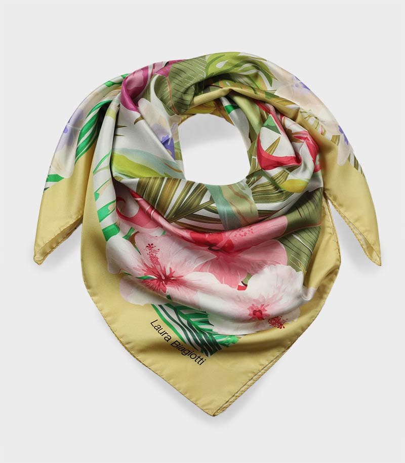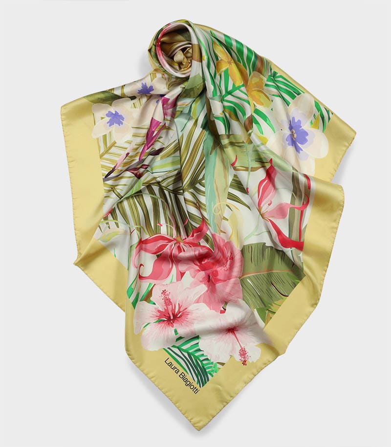 Apaszka jedwabna włoska 90x90 kwiaty tropikalne przyciąga uwagę wyrazistym wzorem oraz świeżą, słoneczną kolorystyką. Kompozycja wygląda lekko, dlatego całość prezentuje się efektownie i bardzo stylowo.