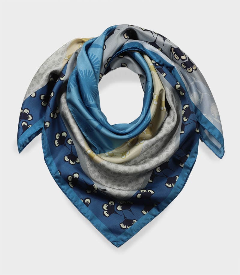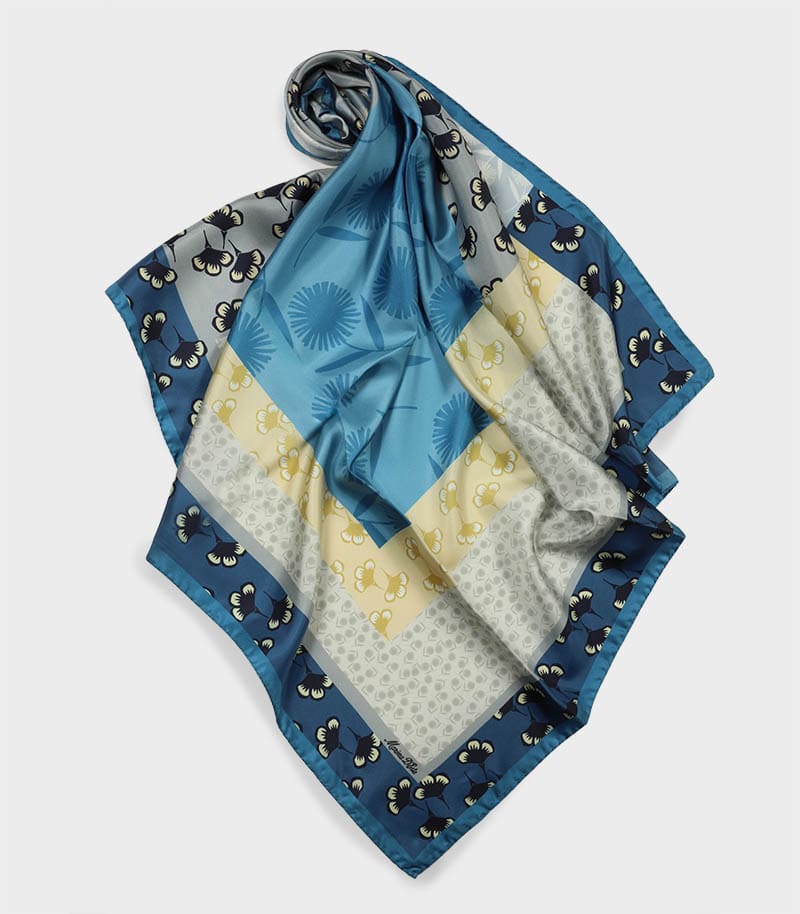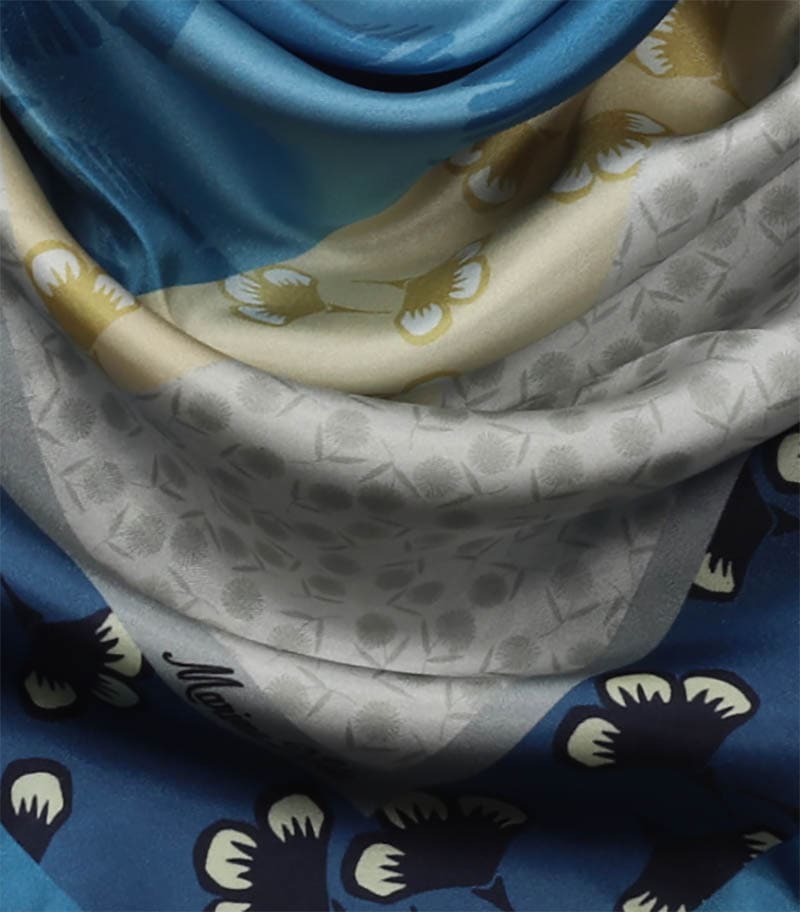 Chusta jedwabna 90x90 Nordic Blue wyróżnia się delikatnym rysunkiem inspirowanym naturą. Jednocześnie miękkie przejścia kolorów budują głębię. Dzięki temu każdy fragment wygląda wyjątkowo.