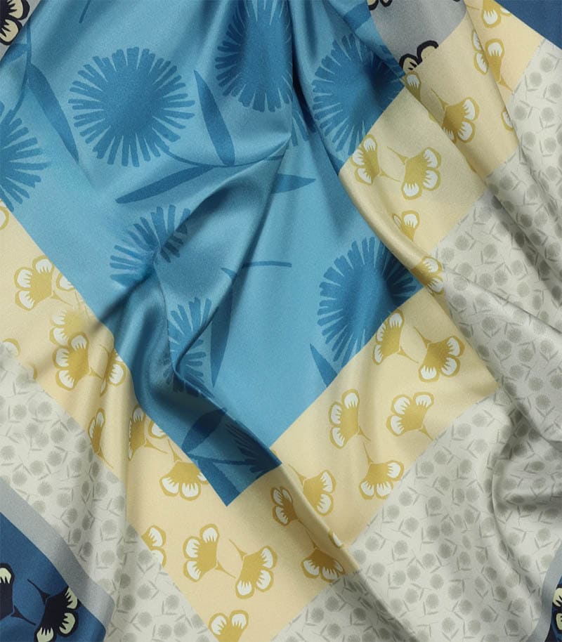Chusta jedwabna włoska 90x90 Nordic Blue zachwyca subtelnym, kwiatowym wzorem oraz elegancką, spokojną kolorystyką. Kompozycja tworzy efekt lekkości. Dlatego całość prezentuje się harmonijnie i bardzo stylowo.