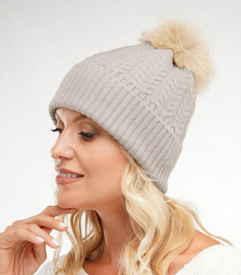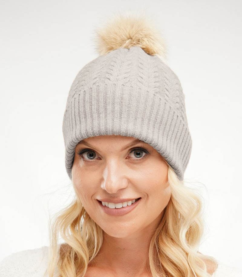 Czapka kaszmirowa damska. Wywijany brzeg czapki na 7-8 cm. Wykonana z pomponem w kolorze jednolitym, z wzorkiem łańcuszka. Idealna na chłodny jesienny i zimowy okres. Pasuje do eleganckich stylizacji.