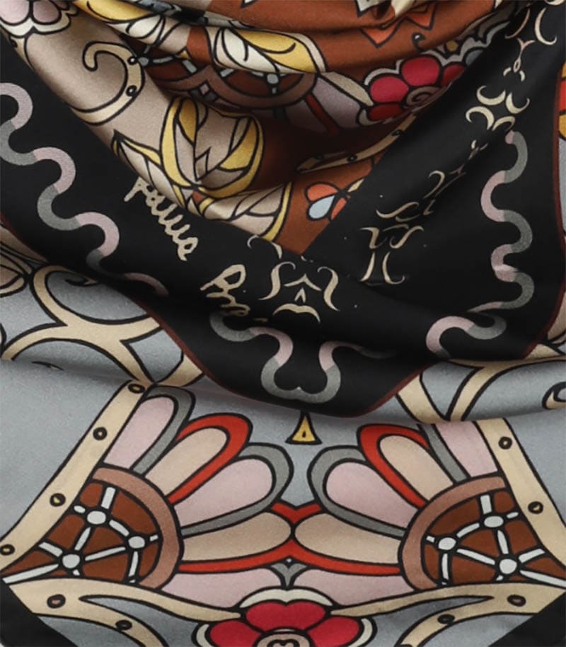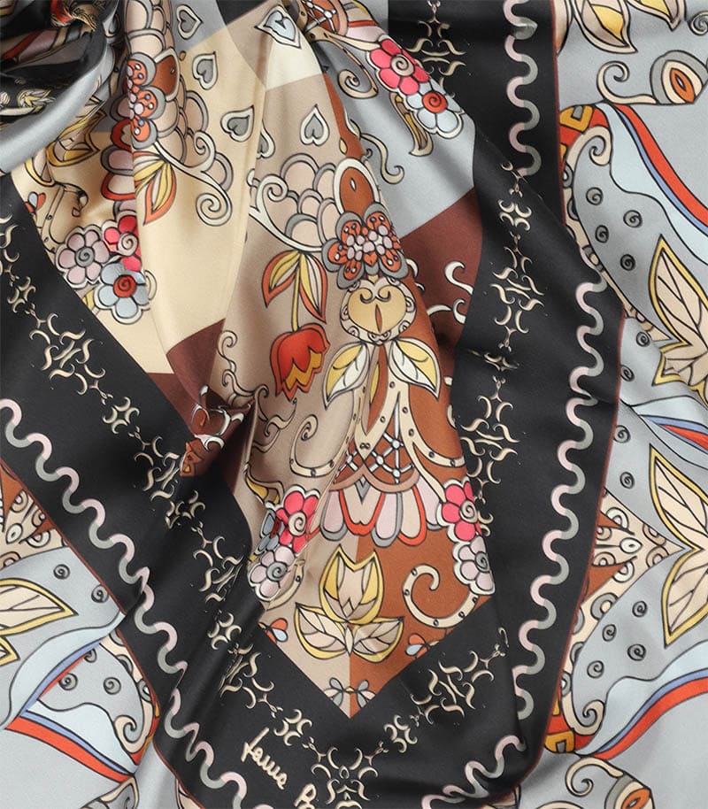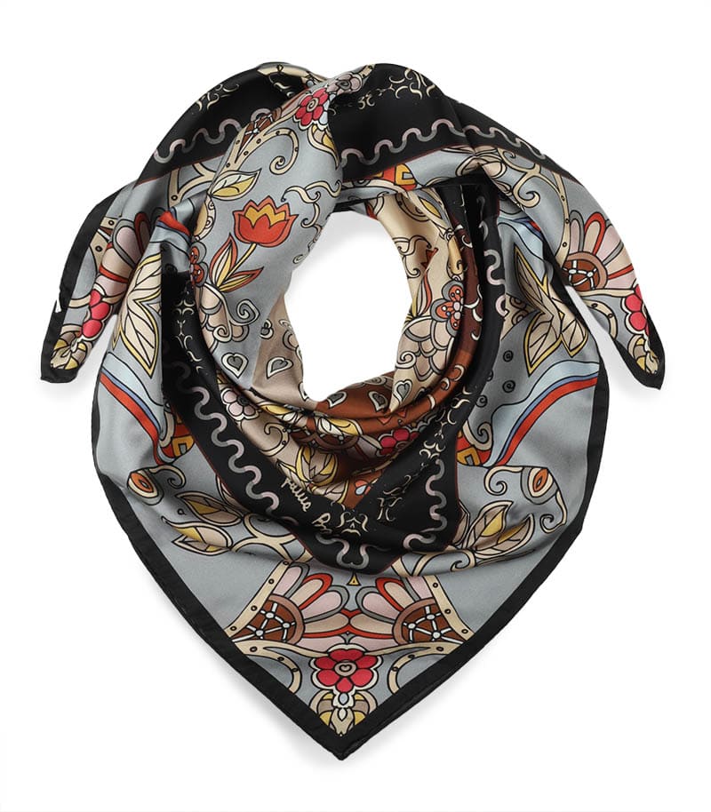 Elegancka apaszka jedwabna 90x90 Laura Biagiotti w kolorze szarym to wyjątkowe zwieńczenie każdej Twojej stylizacji. Zafunduj sobie nutkę wyrafinowanego luksusu! To niepowtarzalny i wyjątkowy projekt. Tę apaszkę wykorzystasz jako dodatek do biznesowego garnituru albo romantycznej, zwiewnej sukienki na wieczorne wyjście. Subtelny wzór przyciąga uwagę, ale nie przytłacza, a intensywne kolory podkreślą Twoją urodę. Zawiąż ją na szyi lub po prostu zarzuć na ramiona – tak, jak lubisz. Będzie także nieocenionym dodatkiem jako apaszka/chusta na głowę. Apaszka powstała z 100% -ego naturalnego jedwabiu.