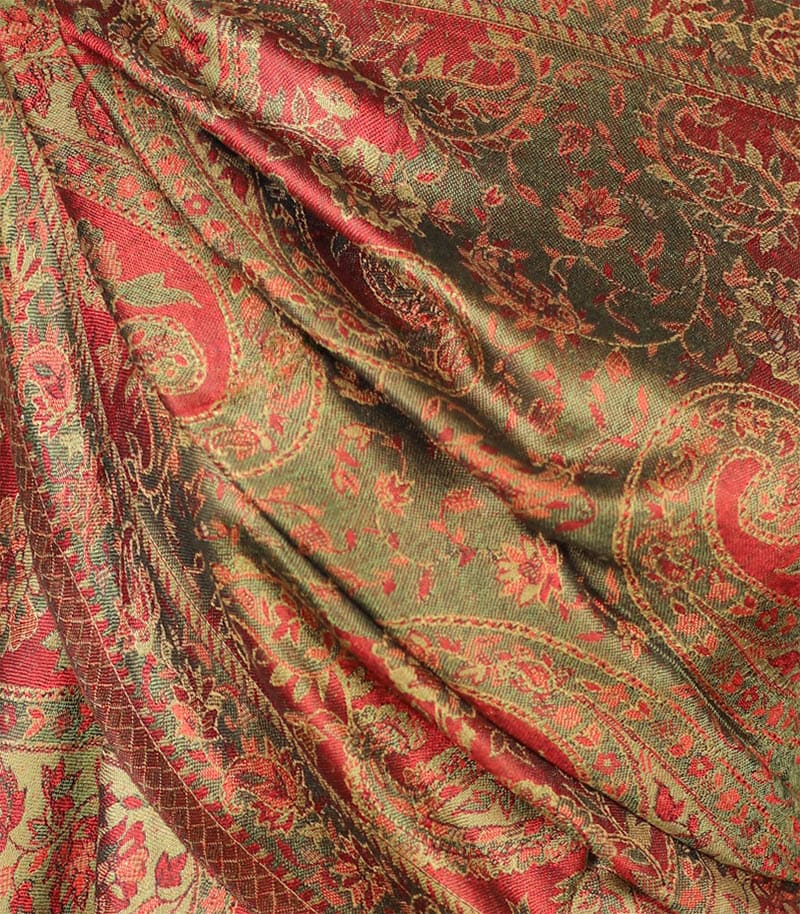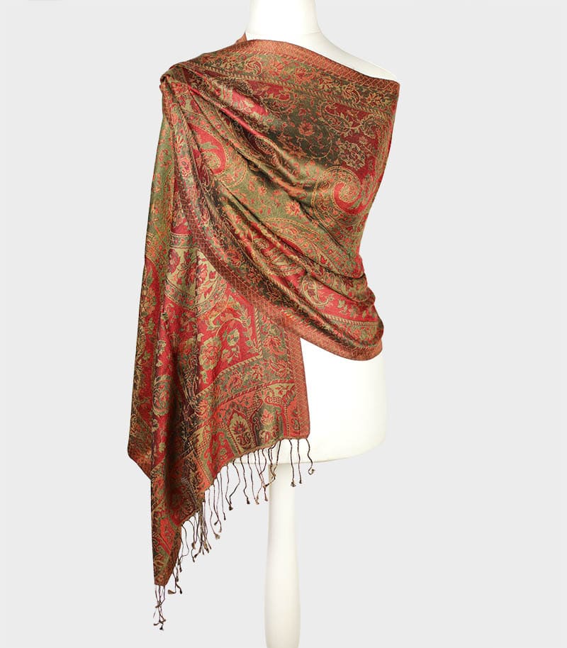 Szal jedwabny orientalny w odcieniach czerwieni i zieleni wyróżnia się bogatym, dekoracyjnym wzorem inspirowanym klasycznym stylem. Wyrazista kompozycja barw oraz precyzyjne detale nadają całości elegancki i ponadczasowy charakter.