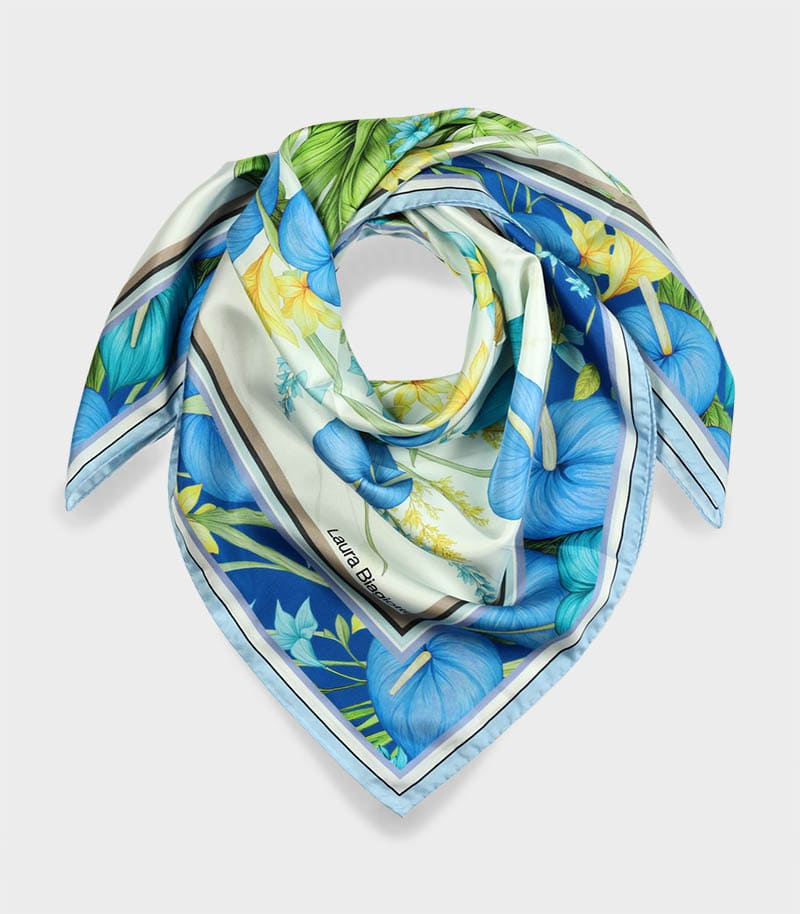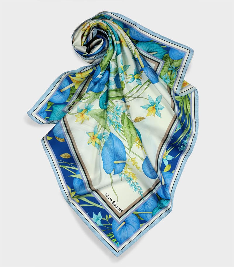 Apaszka jedwabna Laura Biagiotti 90x90 w eleganckim niebieskim kolorze, to luksusowy dodatek inspirowany włoską modą i ponadczasową elegancją. Ta markowa apaszka jedwabna damska została wykonana z najwyższej jakości naturalnego jedwabiu.