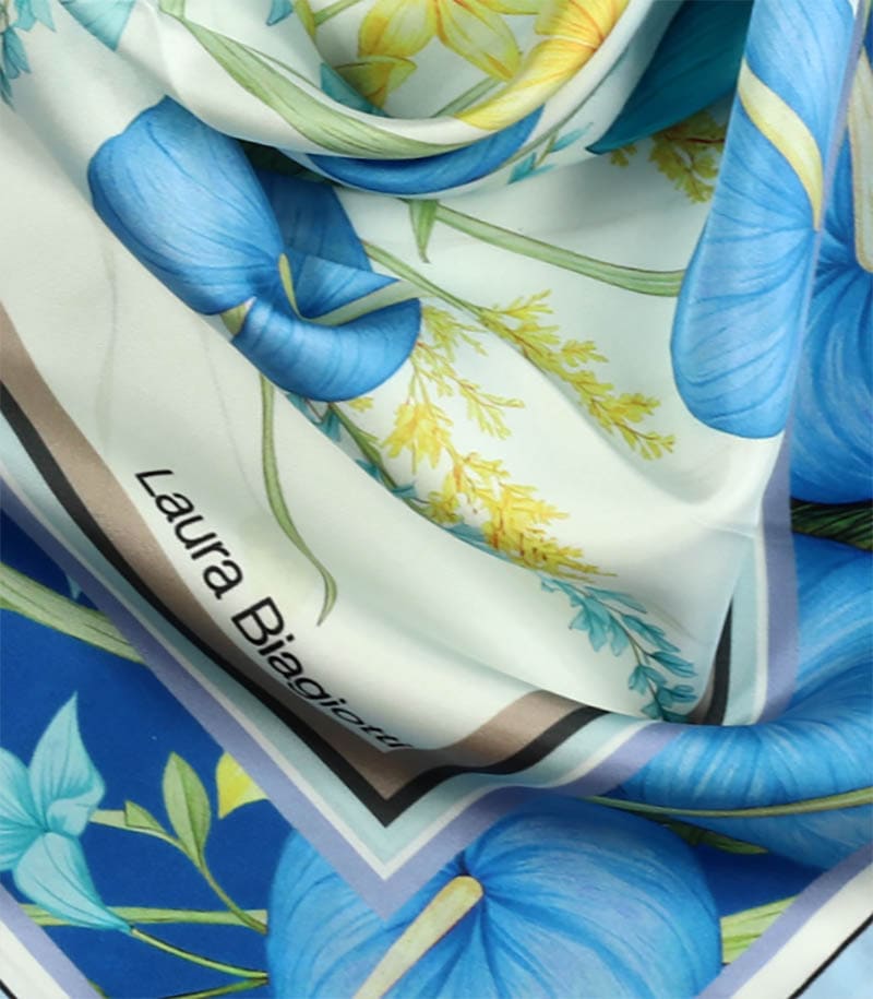 Niebieska kwiatowa apaszka jedwabna 90x90 Laura Biagiotti włoska premium