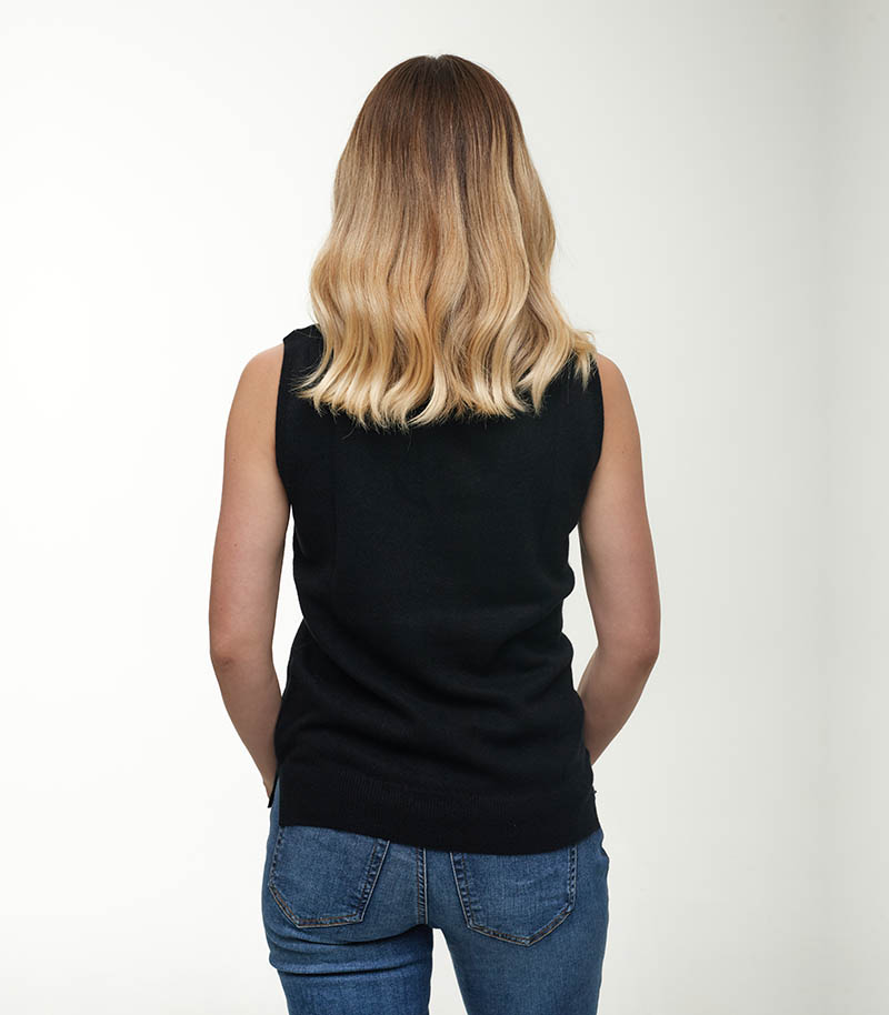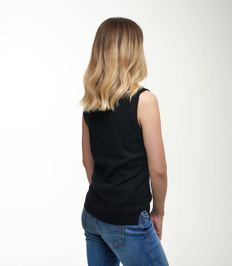 Nasz sweter bez rękawów czarny to połączenie elegancji, lekkości i wyjątkowego komfortu. Wykonany w 100% z najwyższej jakości kaszmiru, zachwyca miękkością i doskonałym dopasowaniem do sylwetki. Idealny dla osób, które cenią ponadczasowy styl i naturalny luksus.