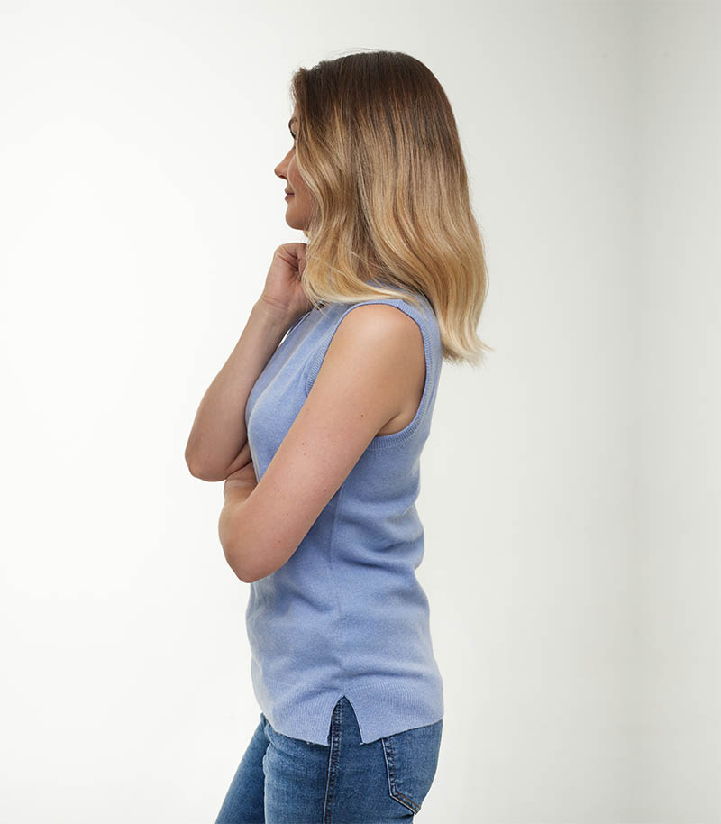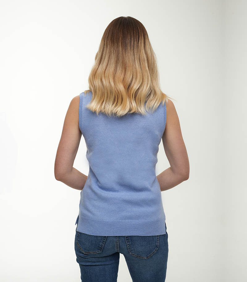 Nasz sweter bez rękawów niebieski to połączenie elegancji, lekkości i wyjątkowego komfortu. Wykonany w 100% z najwyższej jakości kaszmiru, zachwyca miękkością i doskonałym dopasowaniem do sylwetki. Idealny dla osób, które cenią ponadczasowy styl i naturalny luksus.
