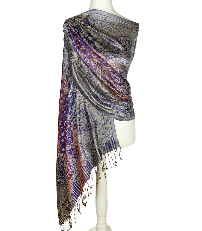 Typ: szal jedwabny ; Kolor: granatowy, śliwkowy, beżowy; Rozmiar: 70 cm x 200 cm; Materiał: 100% jedwab;