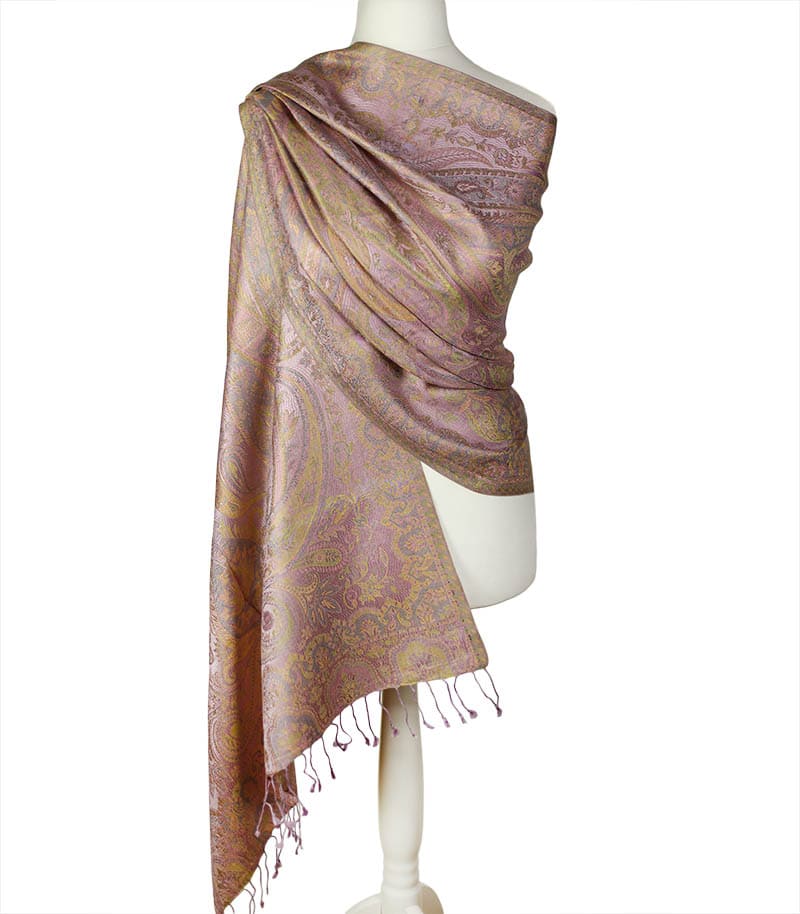 Typ: szal jedwabny ; Kolor: liliowy, złoty; Rozmiar: 70 cm x 200 cm; Materiał: 100% jedwab;