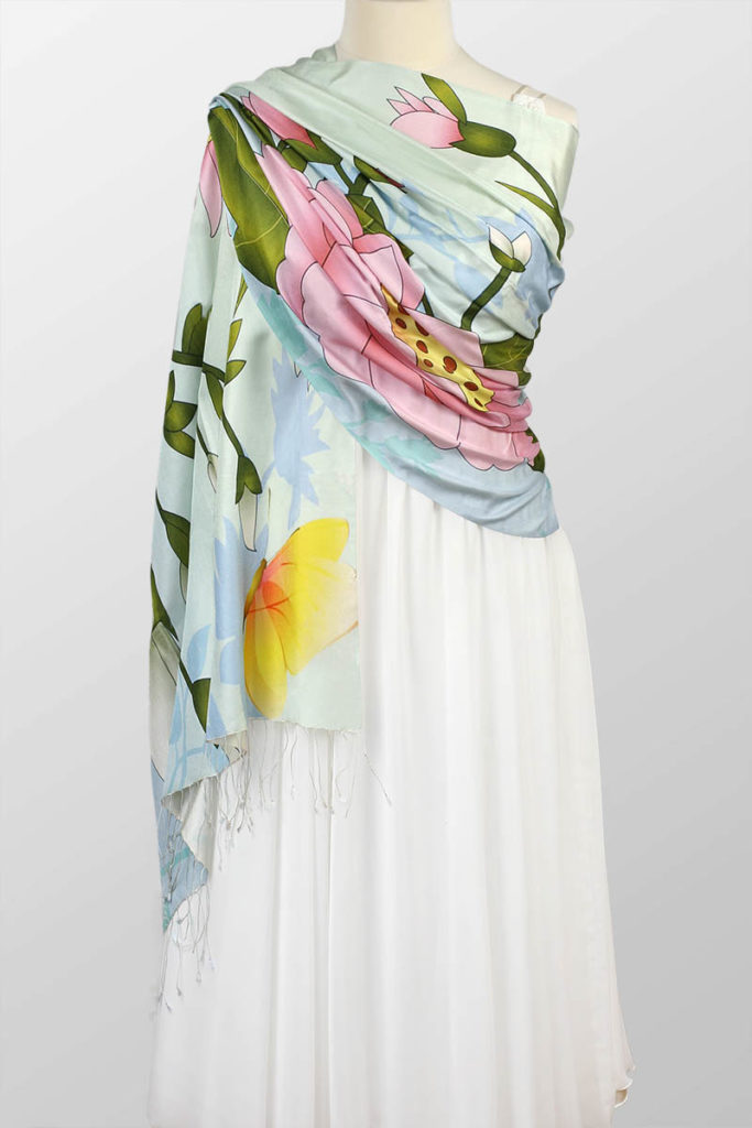 Delikatny dwustronny szal z 100% jedwabiu. Jest zwiewny i delikatny. Może być doskonałym dodatkiem do stroju wieczorowego. Włókno jedwabiu jest delikatne, bardzo lekkie o naturalnym połysku.