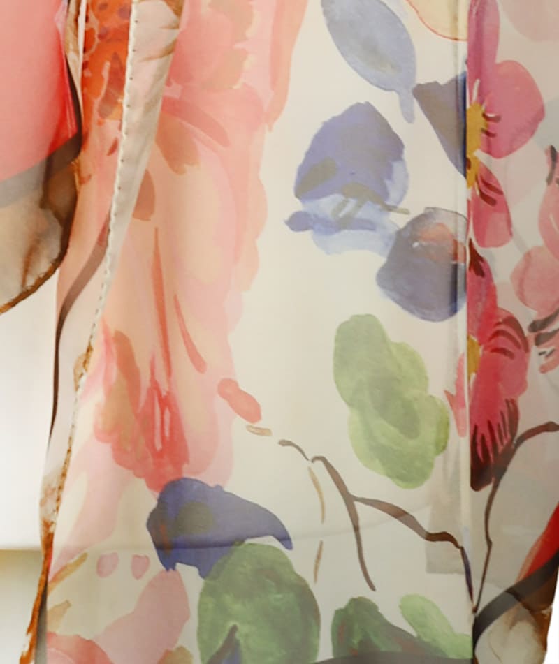 Elegancki szalik jedwabny kwiatowy Marina D'Este to stylowy dodatek w okresie wiosenno-letnim, który podkreśla charakter codziennych i eleganckich stylizacji. Wykonany z naturalnego jedwabiu we Włoszech zachwyca lekkością oraz komfortem noszenia. Dekoracyjny wzór kwiatowy dodaje świeżości i ponadczasowej elegancji, dlatego szalik doskonale uzupełnia kobiecą garderobę.