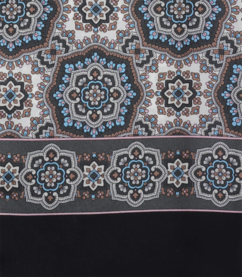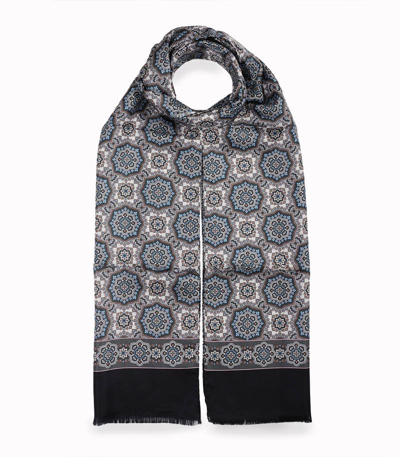 Dwustronny szalik jedwabny męski, w wygodnym rozmiarze 30x160cm. Naturalna przędza jedwabna jest subtelna, bardzo lekka o naturalnym połysku dlatego szalik ten doskonale się układa, jest zwiewny i delikatny. Szalik w kolorze beżowym w interesującym wzornictwie. Wykończenie stanowią centymetrowe frędzle.