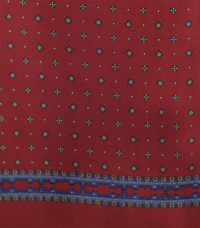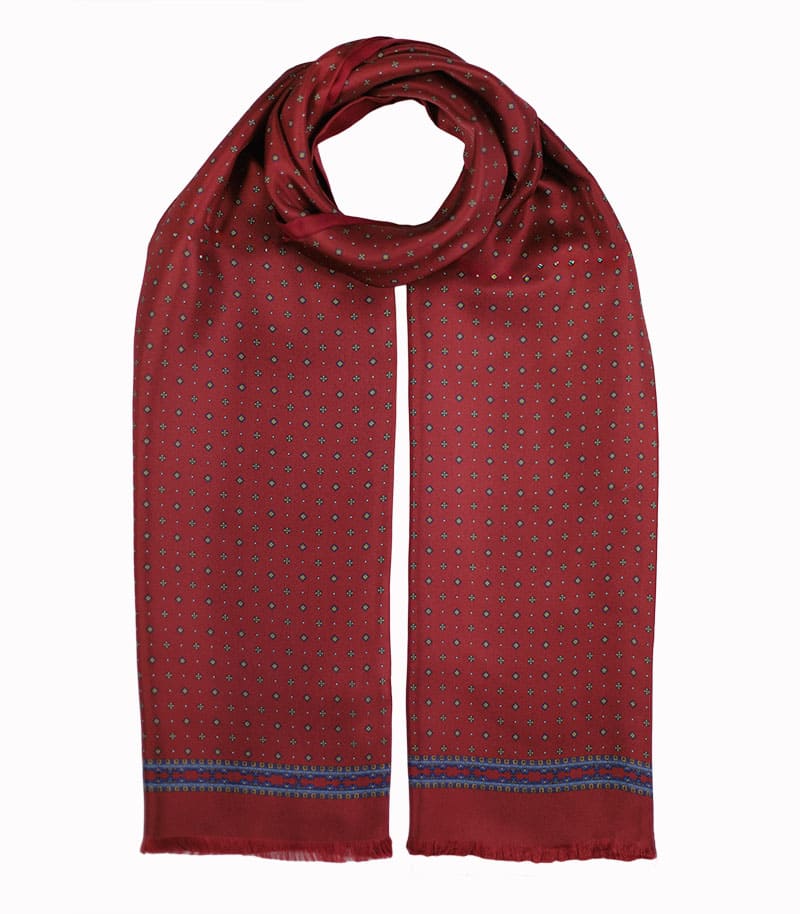 Dwustronny szalik jedwabny męski, z wełnianą podszewką w wygodnym rozmiarze 30x160cm. Naturalna przędza jedwabna jest subtelna, bardzo lekka o naturalnym połysku dlatego szalik ten doskonale się układa, jest zwiewny i delikatny. Szalik w kolorze bordowy w interesującym wzornictwie. Wykończenie stanowią centymetrowe frędzle.