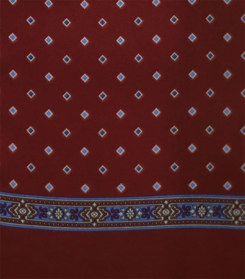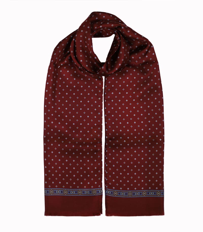 Dwustronny szalik jedwabny męski, w wygodnym rozmiarze 30x160cm. Naturalna przędza jedwabna jest subtelna, bardzo lekka o naturalnym połysku dlatego szalik ten doskonale się układa, jest zwiewny i delikatny. Szalik w kolorze bordowym w interesującym wzornictwie. Wykończenie stanowią centymetrowe frędzle.