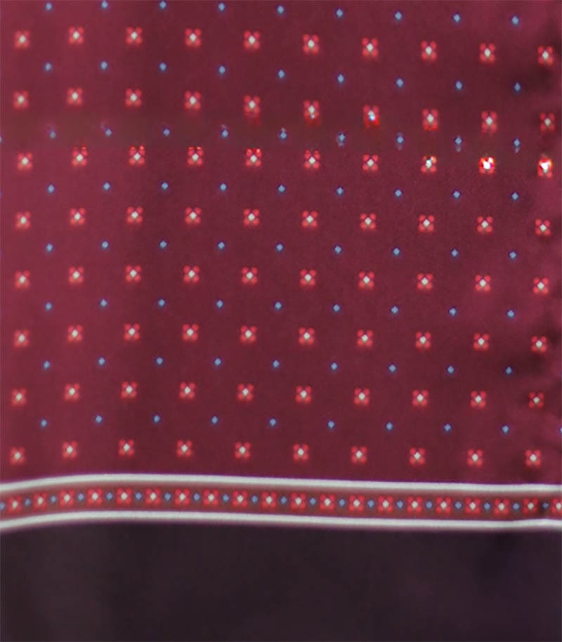 Dwustronny szalik jedwabny męski, w wygodnym rozmiarze 30x160cm. Naturalna przędza jedwabna jest subtelna, bardzo lekka o naturalnym połysku dlatego szalik ten doskonale się układa, jest zwiewny i delikatny. Szalik w kolorze bordowym w interesującym wzornictwie. Wykończenie stanowią centymetrowe frędzle.