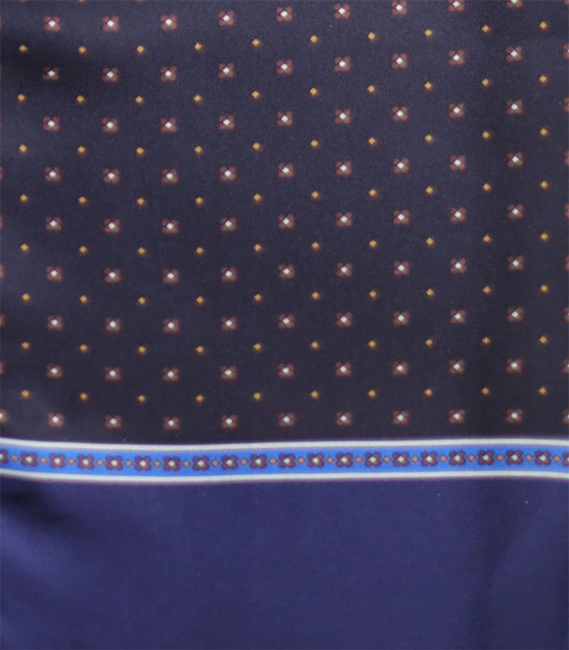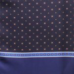 Dwustronny szalik jedwabny męski, z wełnianą podszewką w wygodnym rozmiarze 30x160cm. Naturalna przędza jedwabna jest subtelna, bardzo lekka o naturalnym połysku dlatego szalik ten doskonale się układa, jest zwiewny i delikatny. Szalik w kolorze granatowym w interesującym wzornictwie. Wykończenie stanowią centymetrowe frędzle.