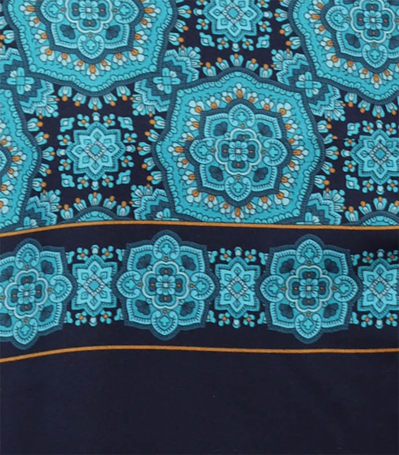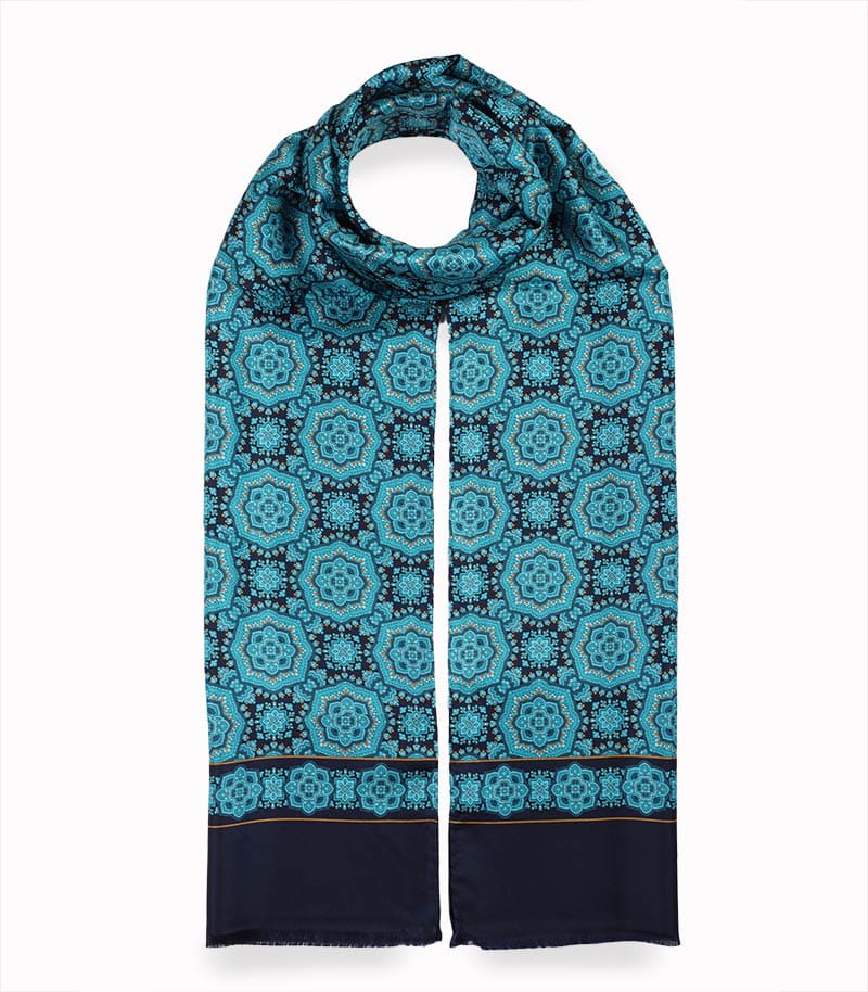 Dwustronny szalik jedwabny męski, w wygodnym rozmiarze 30x160cm. Naturalna przędza jedwabna jest subtelna, bardzo lekka o naturalnym połysku dlatego szalik ten doskonale się układa, jest zwiewny i delikatny. Szalik w kolorze turkusowym w interesującym wzornictwie. Wykończenie stanowią centymetrowe frędzle.