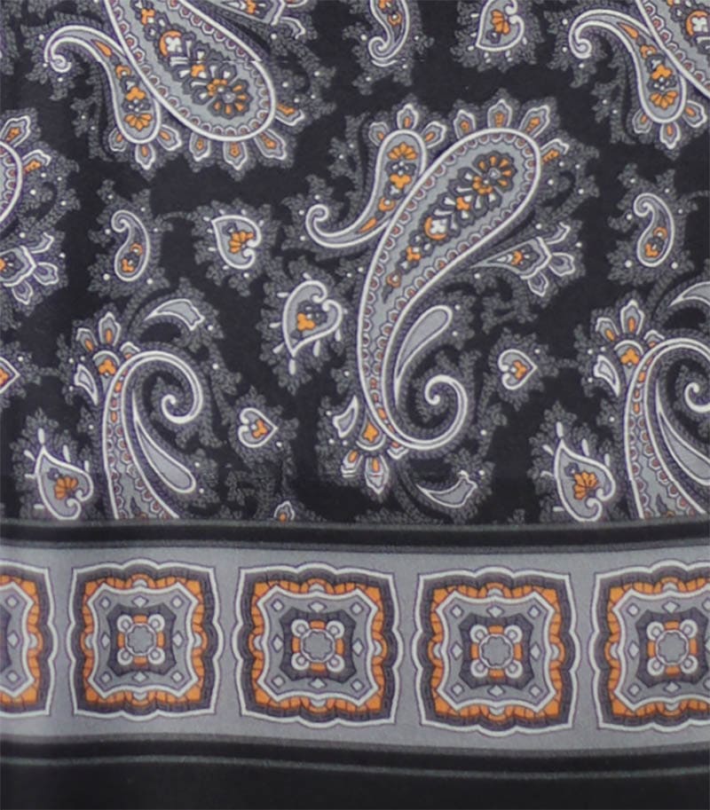 Dwustronny szalik jedwabny męski, w wygodnym rozmiarze 30x160cm. Naturalna przędza jedwabna jest subtelna, bardzo lekka o naturalnym połysku dlatego szalik ten doskonale się układa, jest zwiewny i delikatny. Szalik w kolorze czarnym w interesującym wzornictwie. Wykończenie stanowią centymetrowe frędzle.