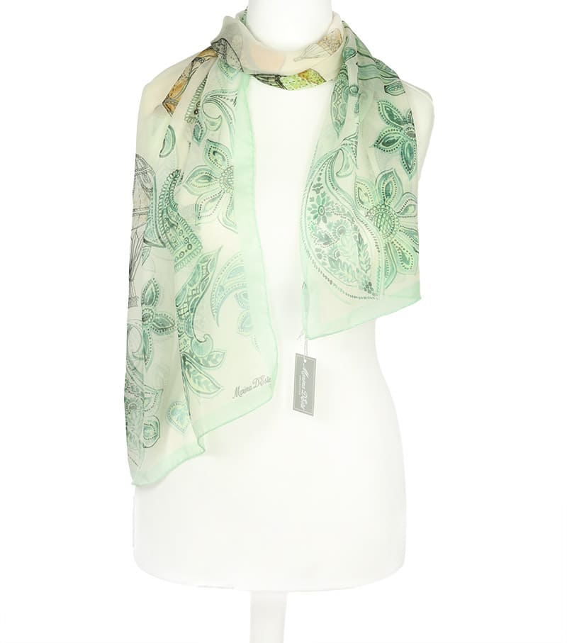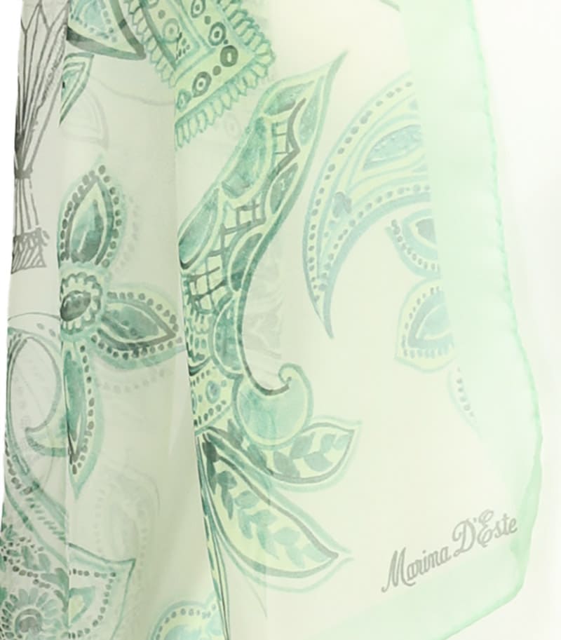 Elegancki szalik jedwabny miętowy Marina D'Este to stylowy dodatek w okresie wiosenno-letnim, który podkreśla charakter codziennych i eleganckich stylizacji. Wykonany z naturalnego jedwabiu we Włoszech zachwyca lekkością oraz komfortem noszenia. Dekoracyjny wzór orientalny dodaje świeżości i ponadczasowej elegancji, dlatego szalik doskonale uzupełnia kobiecą garderobę.