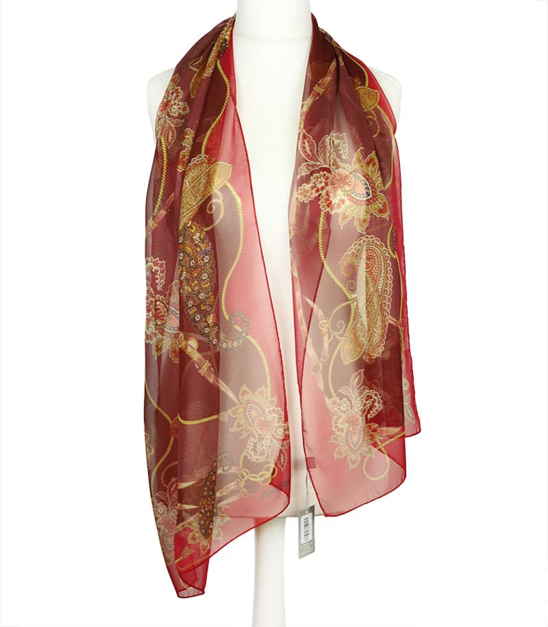 Elegancki szalik jedwabny czerwono-burgundowy damski Marina D'Este to stylowy dodatek w okresie wiosenno-letnim, który podkreśla charakter codziennych i eleganckich stylizacji. Wykonany z naturalnego jedwabiu we Włoszech zachwyca lekkością oraz komfortem noszenia. Dekoracyjny wzór dodaje świeżości i ponadczasowej elegancji, dlatego szalik doskonale uzupełnia kobiecą garderobę.