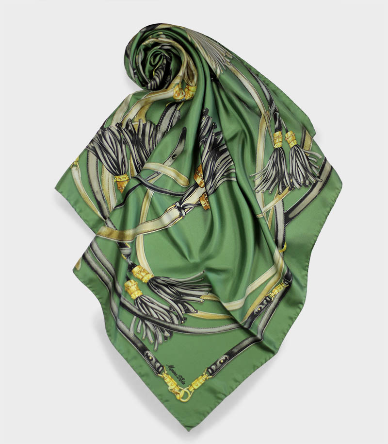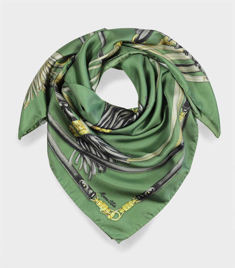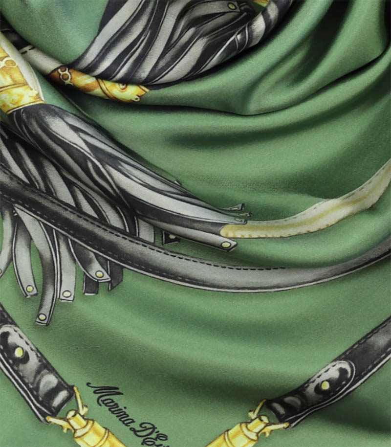 Apaszka jedwabna 90x90 Marina D'Este w eleganckim zielonym kolorze, to luksusowy dodatek inspirowany włoską modą i ponadczasową elegancją. Ta markowa apaszka jedwabna damska została wykonana z najwyższej jakości naturalnego jedwabiu twill.